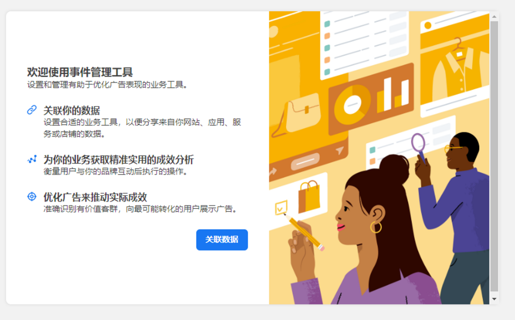 拥有企业帐户后,请在您的商务管理平台中执行以下操作以创建 Facebook 像素(Pixel) :